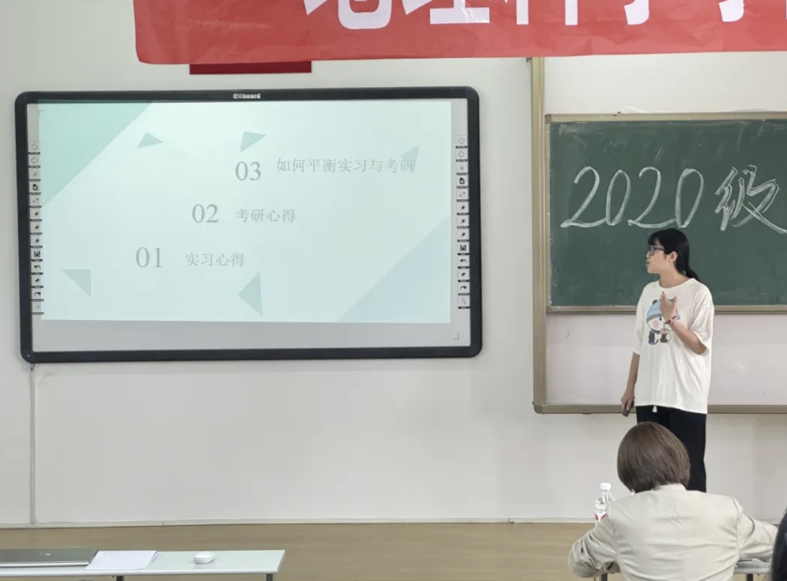 范蓉同学介绍了教学日常任务,也对自身教学经历进行了回顾,为同学们教育实习给出了指南。她也表示在实习中,扮演着地理探索者的角色,带领学生们探寻自然奥秘。同样也深刻体会到,地理教育不仅是知识的传授,更是培养学生对世界的好奇心和理解力,每个学生都是一张未经展开的地图,希望未来的实习生通过讲课,激发学生发现和探索的能力。