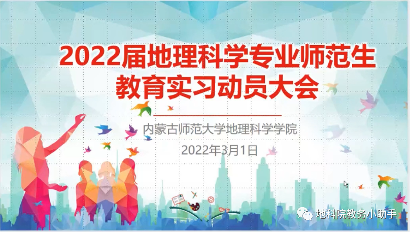 MILE米乐官方网站于2022年3月3日上午举办2022届地理科学专业师范生教育实习动员大会。会议使用腾讯会议平台线上进行。呼和浩特市第三十六中学校长邹静薇、呼和浩特市土默特中学教师张瑜等基地校领导和老师莅临会场;MILE米乐官方网站教学副院长萨楚拉、地理科学系主任乌敦、副主任周丹丹、咏梅、全体实习指导教师和152位实习生参会。大会由MILE米乐官方网站教师赵伟主持。