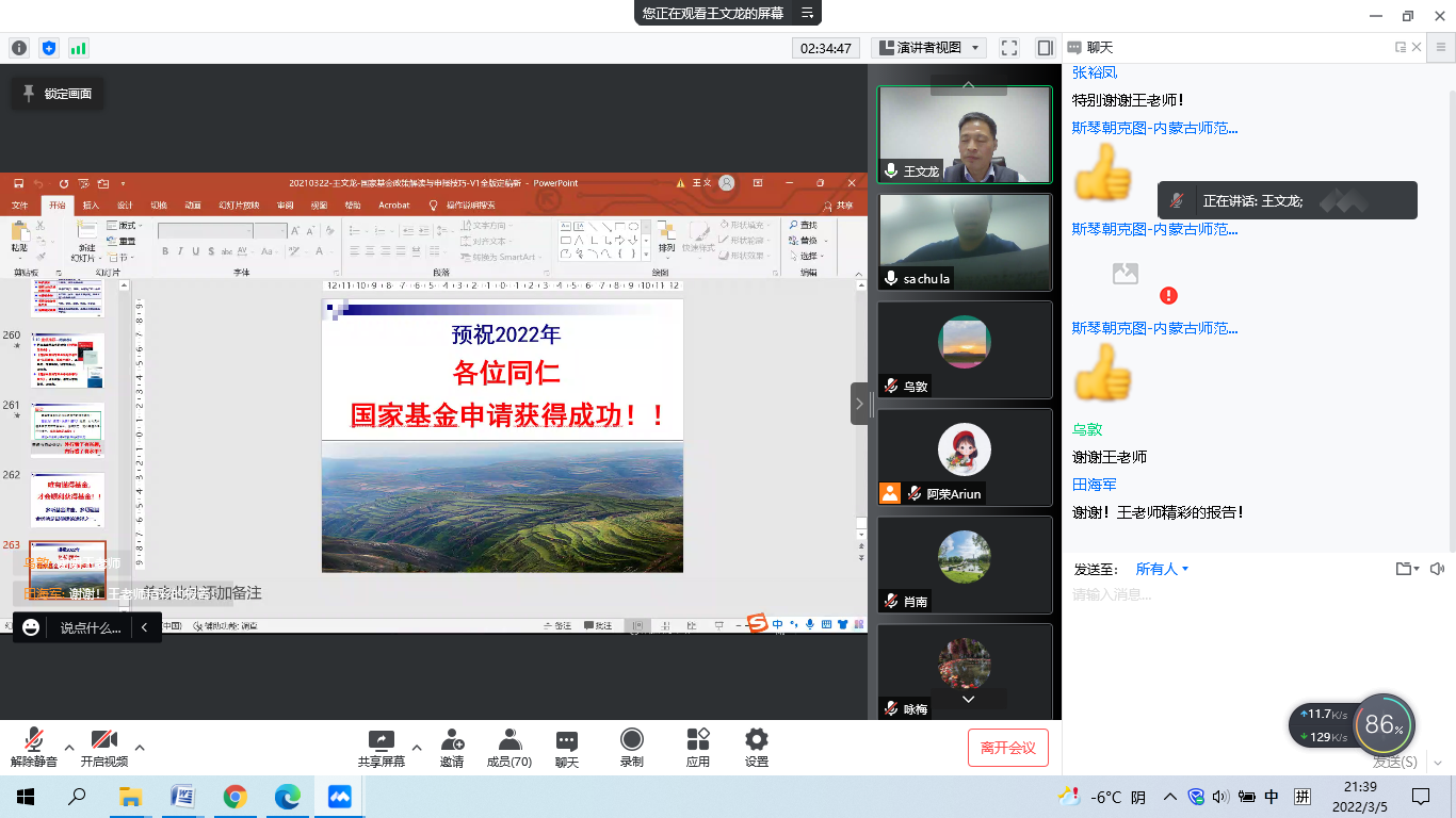 2022年3月5日,MILE米乐官方网站邀请了中国科学院水利部水土保持研究所王文龙研究员,为米乐官网教师分享国家自然科学基金政策的新变化以及申请书的撰写技巧。讲座采用腾讯会议方式进行,由副院长萨楚拉老师主持,书记张裕凤、院长包玉海及近70名老师和博士研究生听取了报告。