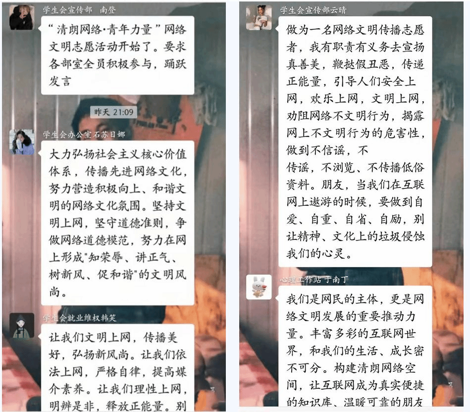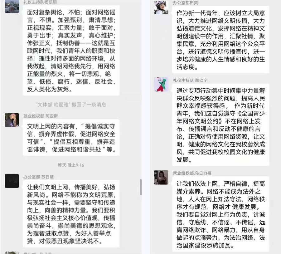 为进一步培育和践行社会主义核心价值观,切实维护国家意识形态安全,动员广大青年积极参与构建网络安全空间,2022年3月4日21:00米乐官网志愿者服务总组织队各部室成员开展“清朗网络,青年力量”活动。通过微信参与有关网络文明话题讨论,引导同学们规范网络语言、举报不良信息、抵制网络谣言,帮助学生树立正确的网络观念,文明上网。