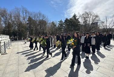 上午10时,冷风裹挟着寒意,全体师生代表整齐列队,祭扫活动在雄壮的国歌声中开始。国歌结束后,在庄严肃穆的氛围中,在场师生代表集体垂首默哀1分钟,向各个历史时期为捍卫国家主权、争取内蒙古各民族独立解放而英勇献身的革命先驱致敬。四周的松柏静静伫立,树枝在风中轻轻摇曳,似在一同缅怀先烈,传递着对英雄们跨越时空的深沉敬意。